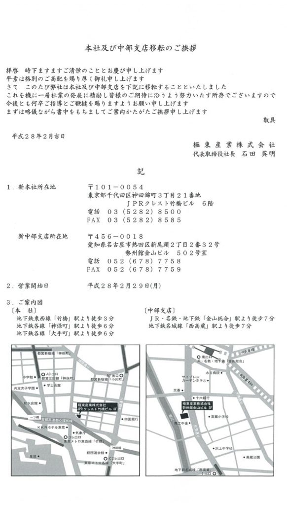 本社及び中部支店移転のご挨拶